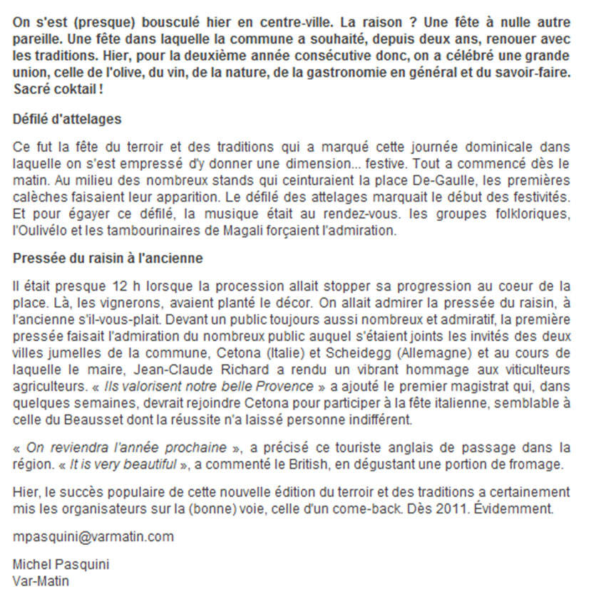 Que dire de plus en effet, que ce qui est relaté dans l’article que consacre Var Matin aujourd’hui à la fête du Terroir qui s’est tenue dimanche au Beausset?