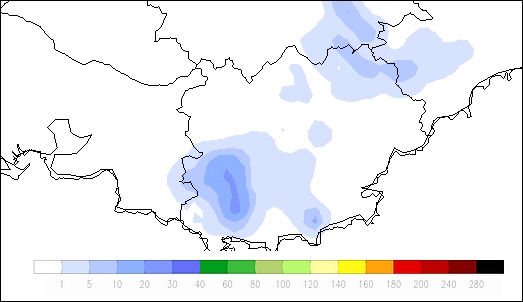 Selon le modèle à maille fine WRF-NMM, la couche de neige pourrait atteindre les 20cm d’épaisseur dans la région du Beausset au dessus de 300m d’altitude.
