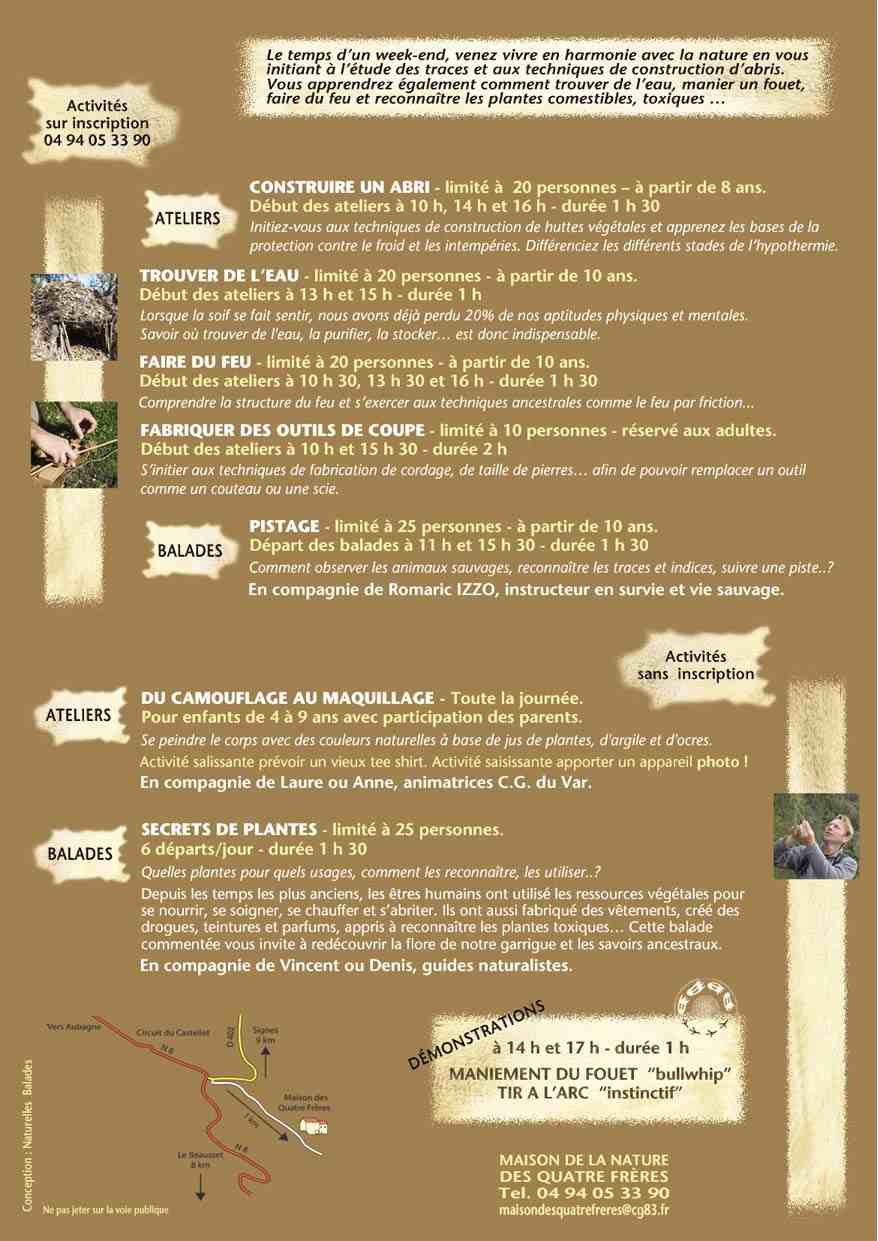 - ATELIERS d’initiation « construction de huttes végétales », « trouver de l’eau », « faire du feu », « fabrication d’outils »