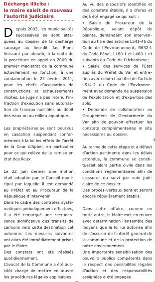 Aujourd’hui, c’est dans le supplément de décembre 2011 au magazine municipal Ensemble que l’on apprend que non seulement « les propriétaires se sont pourvus en cassation suspendant conformément à la loi les effets de l’arrêt de la Cour d’Appel, en particulier pour ce qui relève de la remise en état des lieux » mais qu’il a été « remarqué une recrudescence significative des transits de camions vers cette destination cet automne. »