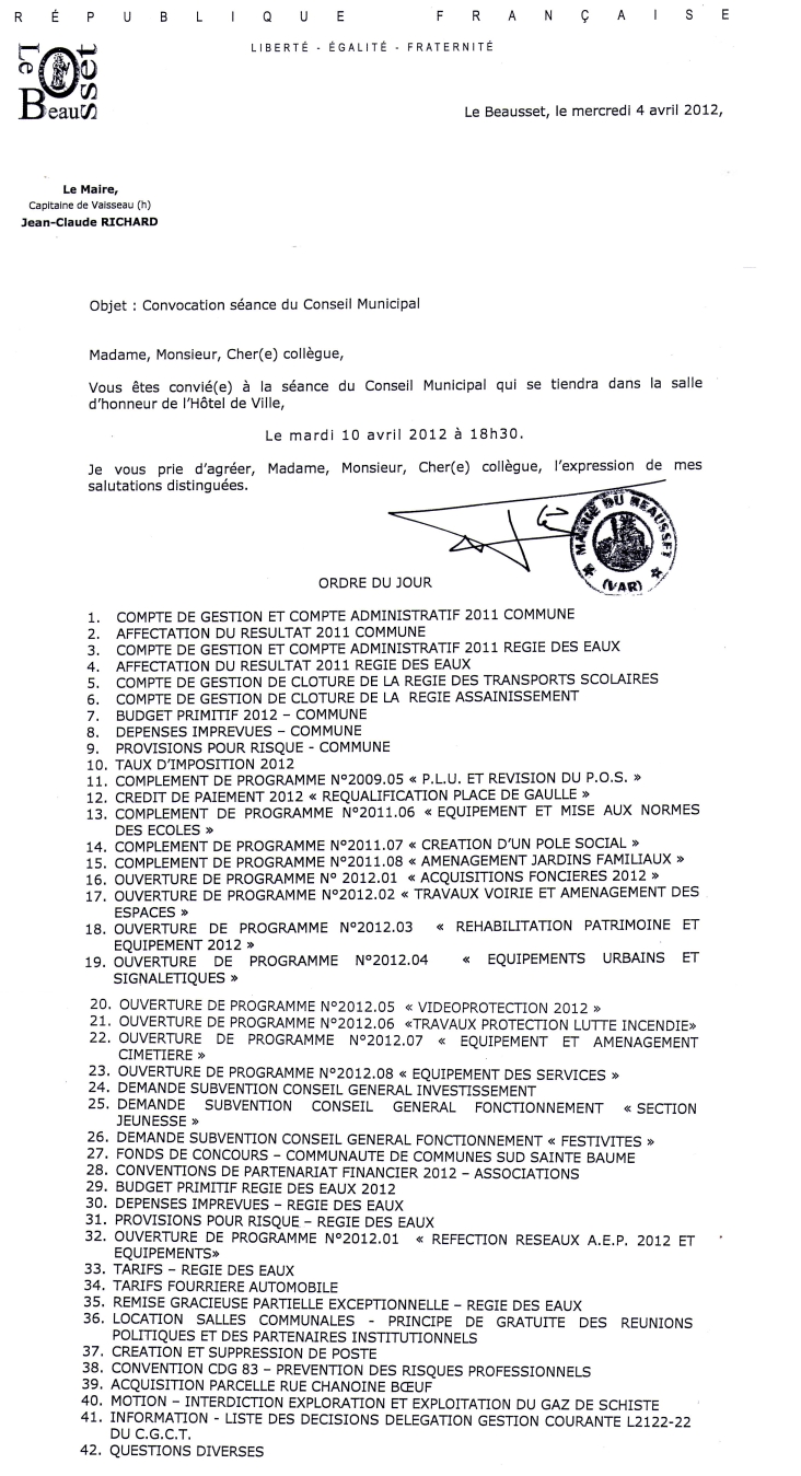 Outre le vote sur les budgets 2012, notez la mise au vote d’une motion sur l’exploration et l’exploitation du gaz de schiste dont nous parlions lors d’un précédent article (voir ici) en nous étonnant que Le Beausset faisait partie des rares communes du Var a n’avoir pas pris position clairement sur ce sujet…