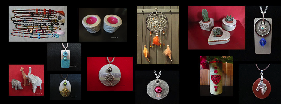 Des colliers avec des socles en béton agrémentés de perles, pendentifs métal, paillettes… , des sautoirs en perles diverses, des bougeoirs et caches pots en béton, des miroirs et des animaux décorés…