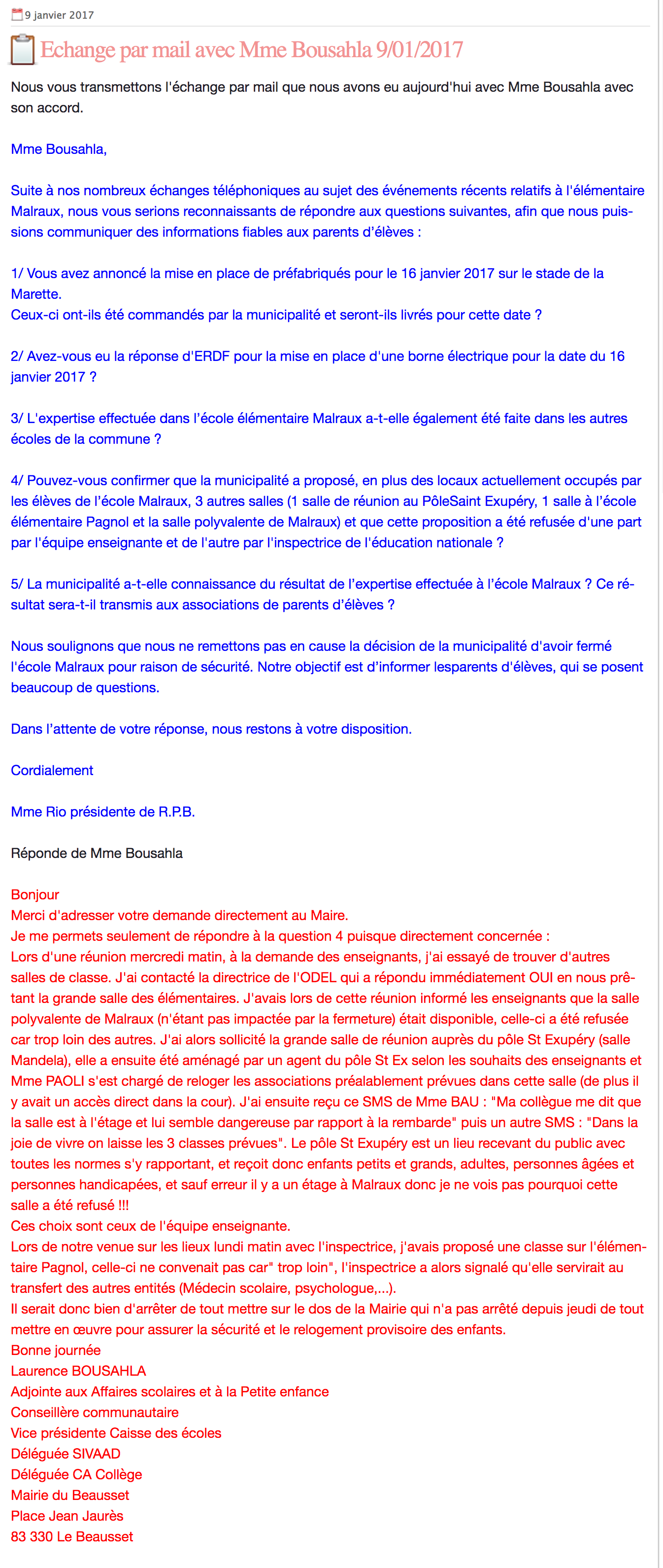 - Le 4 novembre 2016, en Conseil d’école de l’Elémentaire Malraux, la Directrice Mme Bau, demande à ce que des réparations soient menées par la mairie. Ce conseil d’école se tient en présence de l’équipe enseignante, de trois représentants des Parents d’élèves RPB, de la DDEN (représentant le Préfet) et de Laurence Bousahla Adjointe aux maires en charge des écoles accompagnée d’une employée communale en charge des personnels cantine et entretien. Le compte-rendu de ce Conseil d’école qui est publié sur le site RPB (voir ici) indique: