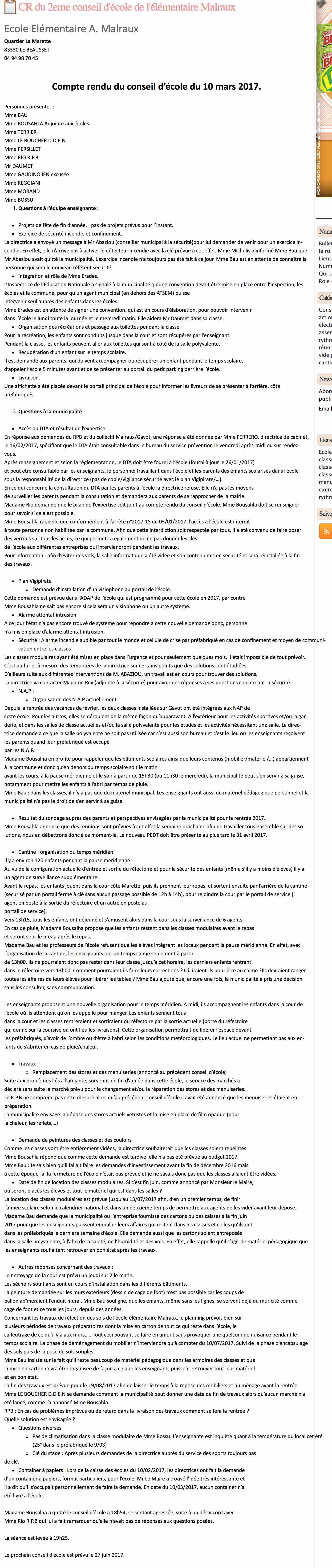 Le deuxième Conseil de l’école élémentaire André Malraux s’est tenu le 10 mars 2017, quelques semaines après les multiples polémiques consécutives à la façon dont la municipalité (et particulièrement le maire et l’adjointe aux écoles) à géré l’affaire de la fermeture de l’école André Malraux (voir nos articles ici, ici, et ici).