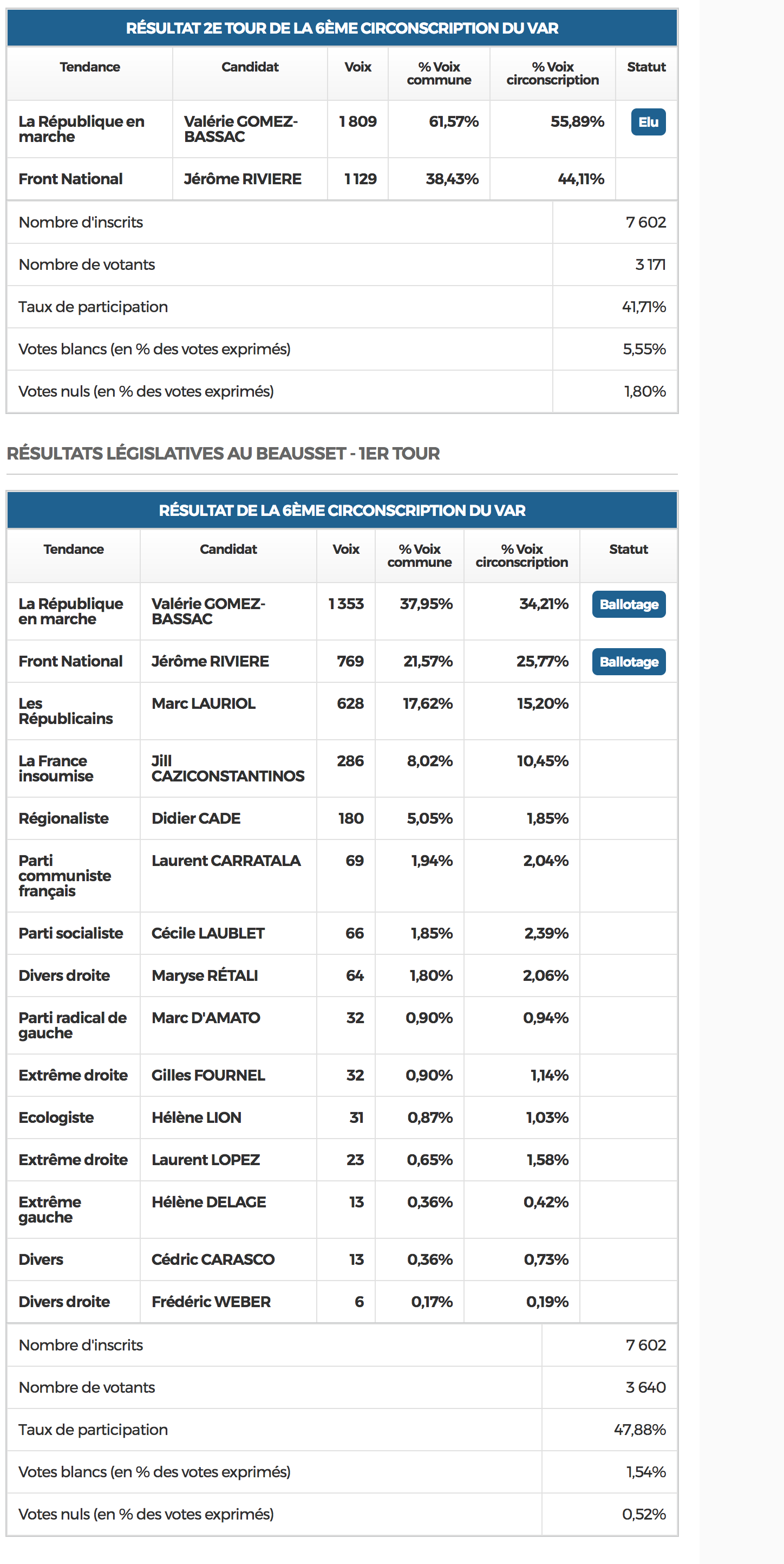 Lors du 2nd tour des législatives de 2017, c’est Valérie GOMEZ-BASSAC candidate La République En Marche, qui a bénéficié du plus grand nombre de voix avec 61,57 % des suffrages. Le deuxième candidat, Jérôme RIVIERE (Front National), a réuni 38,43 % des voix.